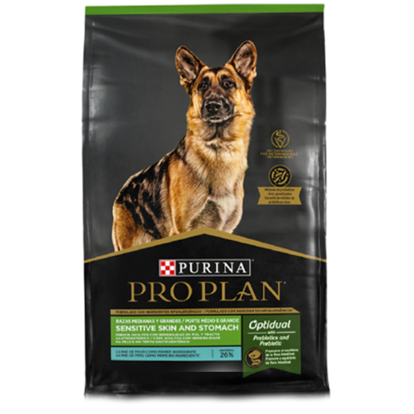 Pro Plan Sensitive Skin & Stomach para Razas Medianas y Grandes está formulado con carne de pavo como primer ingrediente, fuente alternativa de proteína hipoalergénica en perros no expuestos previamente e ideal para perros sensibles. Incluye la tecnología exclusiva Optidual, que combina prebiótico y probióticos vivos garantizados que contribuyen juntos a la salud del sistema digestivo. Alimento seco para perros adultos raza mediana y grande, Piel y estómago Sensible. Con prebioticos y probióticos vivos garantizados que contribuyen juntos a la salud del sistema digestivo.
